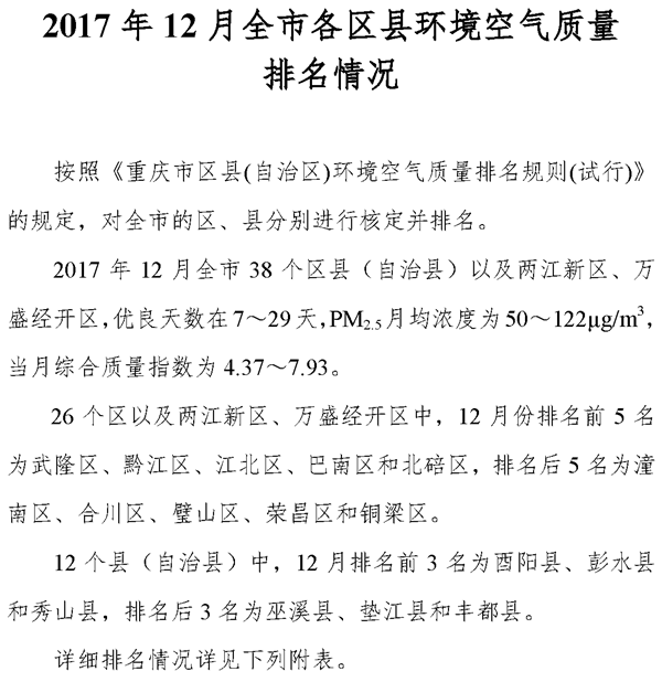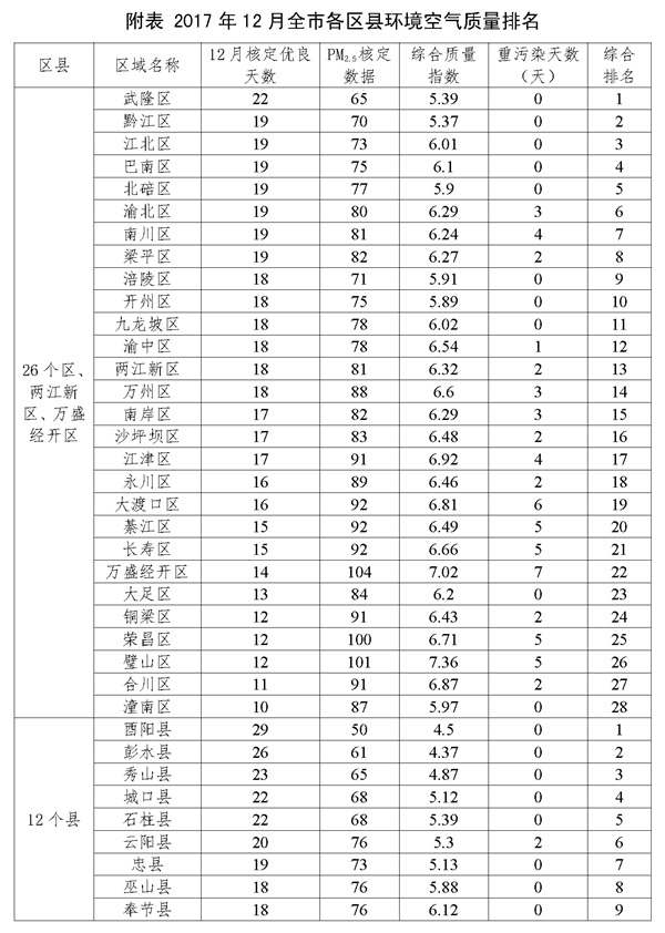 2017年12月全市各区县环境空气质量排名情况